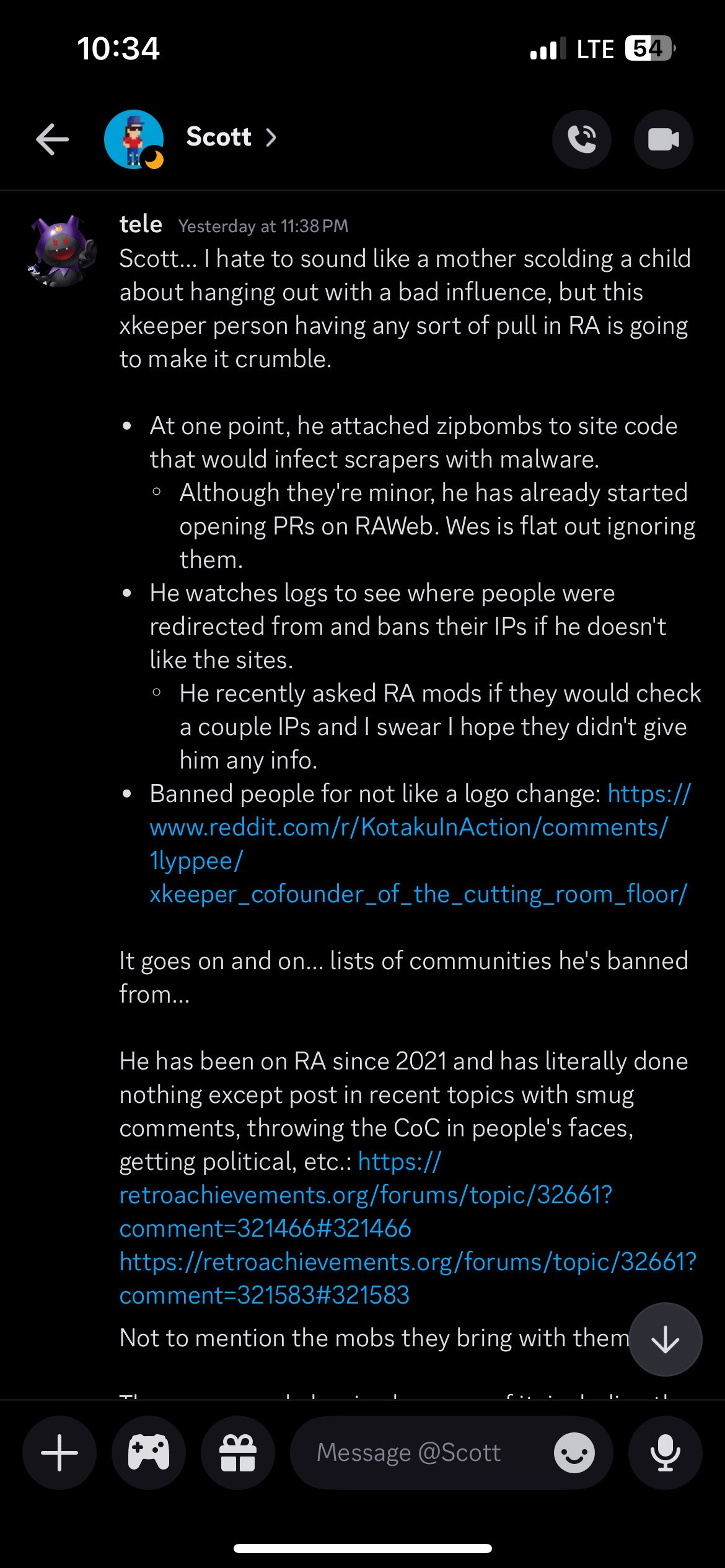 Recent events>in addition to his pastebin, bahamut's mega, onedrive, and dropbox folders also got mass reported and taken down; anons have backups>xkeeper has been providing ips to ra mods for investigation>a thread on the ra forums stayed open for 2 days and ran for 11 pages, but was closed in 10 minutes by hexa after an user named xkeeper>xkeeper has been trying to get his code on retroachievements, but everything's been blocked so far>tele says on discord that he and all other admins are certain bahamut's doxxing was forged by him; no proof is provided
