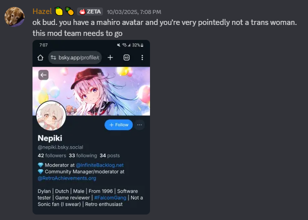 >>723194858I think you ate the last part of your forum green text, anyway to expand>soon as xkeeper was mentioned in a forum thread that was 2 days old>he shows up in a few mins>then hexadigital closed the thread after some more minsHexadigital is directly contacted by xkeeper and is willing to do whatever they want, its obvious.https://retroachievements.org/forums/topic/32785?page=12