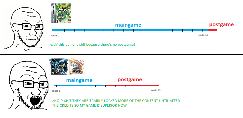 >>723233472The whole problem with Pokemon discussion in the West is there’s a lot of people who liked the Pokemon anime as a kid but they never actually liked the games mechanically so there’s this push for Pokemon to be destroyed so it can be reborn as something new and it’s intensified since the nat dex cut in Gen 8 destroyed some peoples’ “personal narratives” they’ve created with the games as far as the Pokemon they use etc