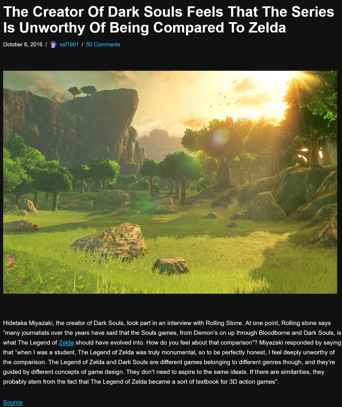 >>723246913Funny that you left out this part.>The Legend of Zelda and Dark Souls are different games belonging to different genres though, and they’re guided by different concepts of game design. Take your headcanon elsewhere.
