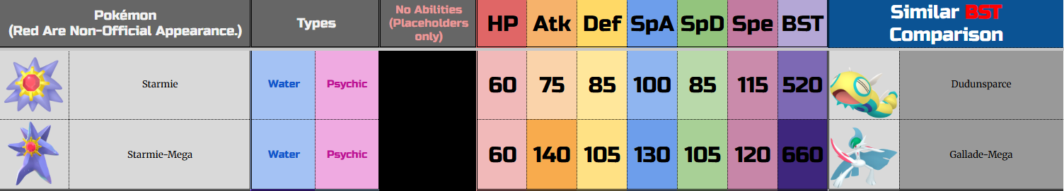 It's literally Starmie but with longer legs. Literally every other Mega or Regional has SOMETHING different