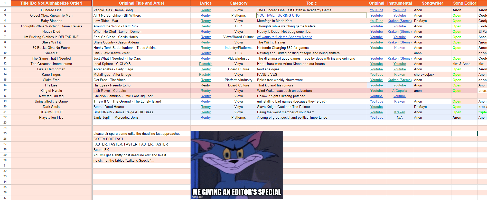 >>723414863simply put, we have two official avenues for submissions: the threads and the song doc. it's an unfortunate slip, nothing to play a blame game over>>723415037all the information is in the unfinished tab, I just ran out of time to fill it in