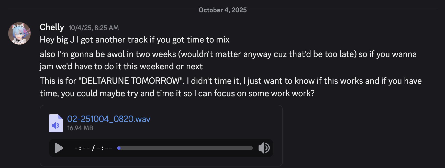 >>723415037K just put that there because she didnt have a finished mix but to show that her parts were done before deadline, just needed editing