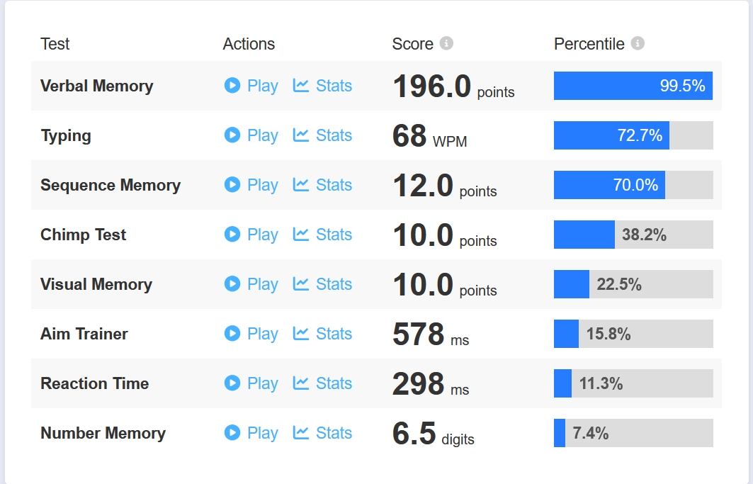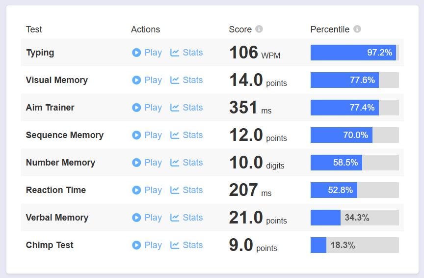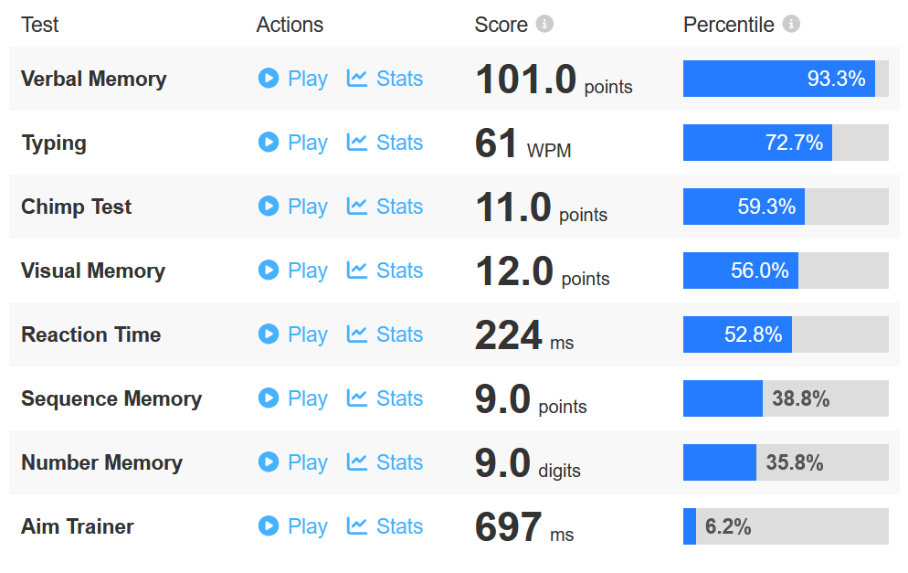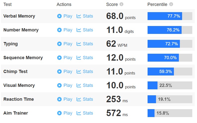 How does /v/ compare?https://humanbenchmark.com/dashboardAll of the tests take less than 10 minutes to complete at a casual pace.