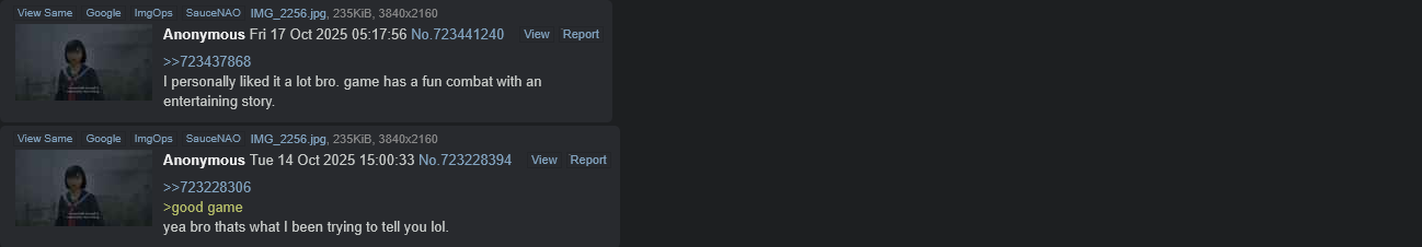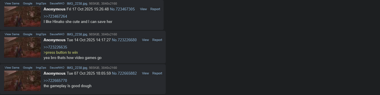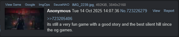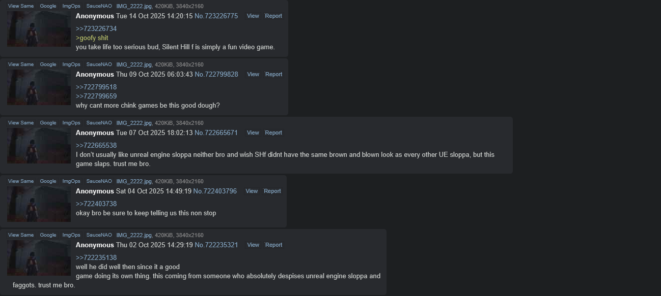 >>723462506Anyone who says this has just never played the game and just shitposts Silent Hill F really exposed all of the bitches here that don't actually play games you're supposed to play the game and think she's unreasonable dumbass she's literally on fucking drugs