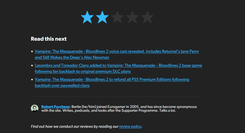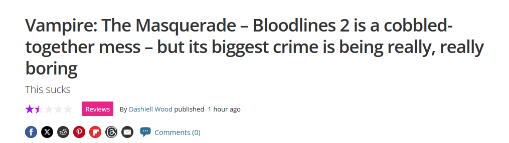 >>723472828kekthe next cope will be "yeah it's bad but not as bad as Bloodlines 1 which was SHIT, VTMB was never a good game"
