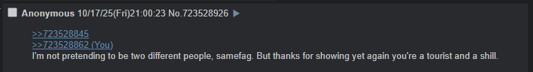 >>723528845>>723528862I'm not pretending to be two different people, samefag. But thanks for showing yet again you're a tourist and a shill.
