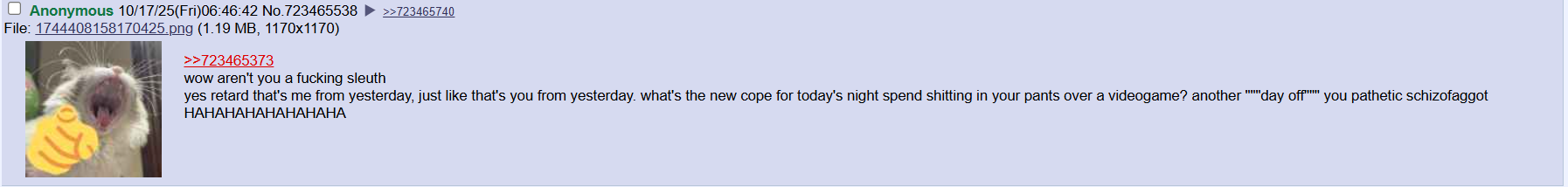 >>723528350>making these threads is funny because that one guy gets so fucking buttmongled pissed when you do.Which guy?