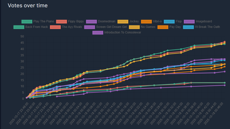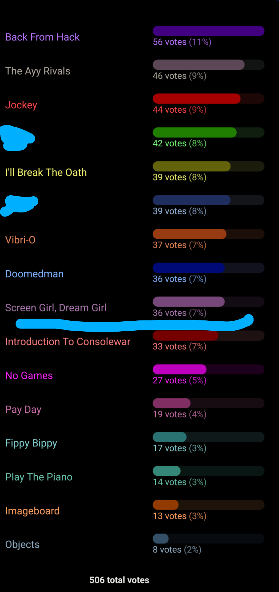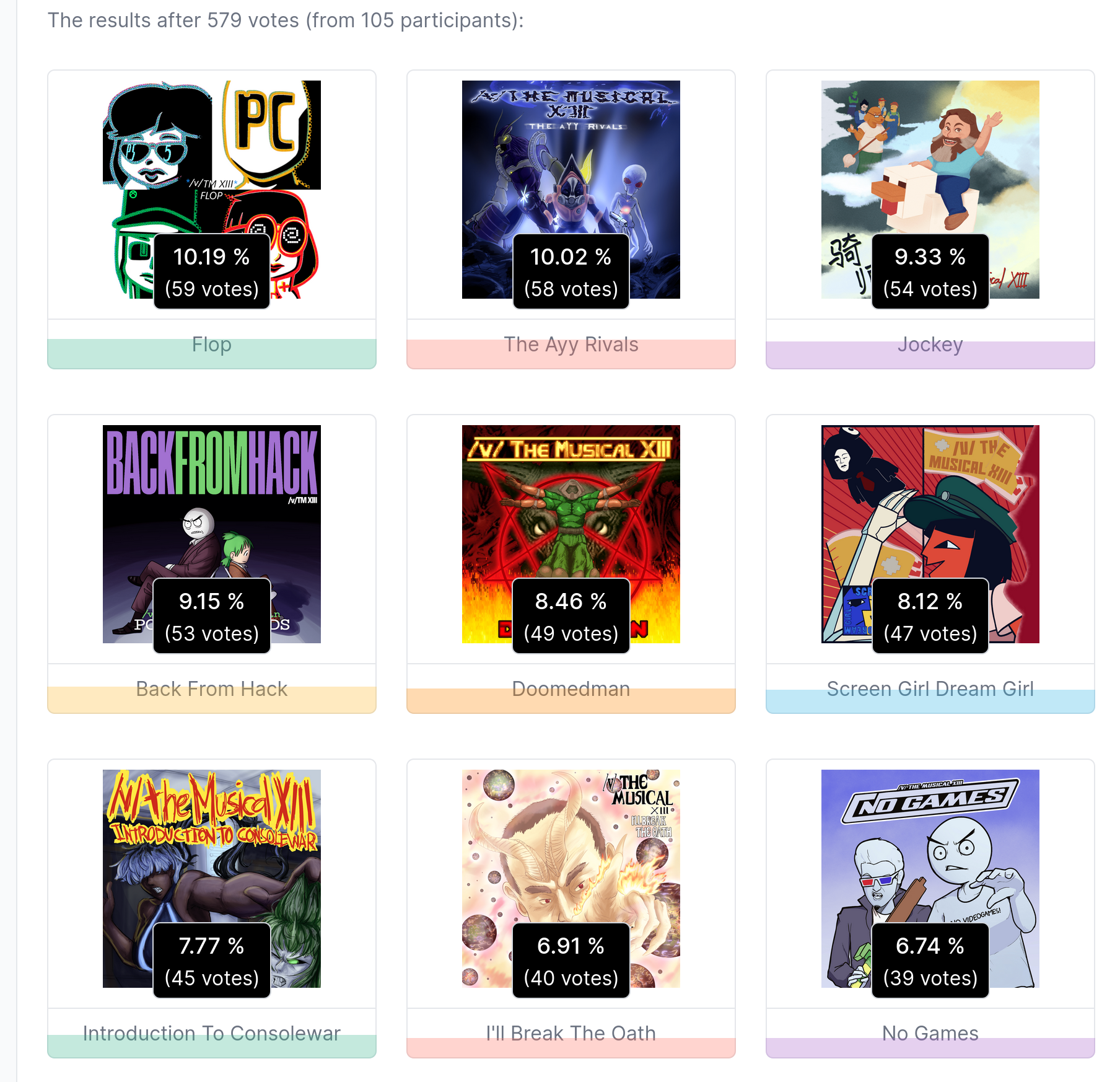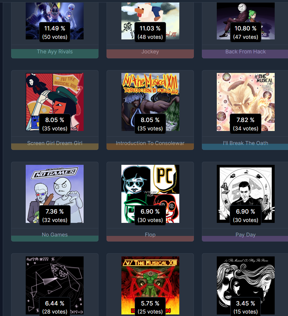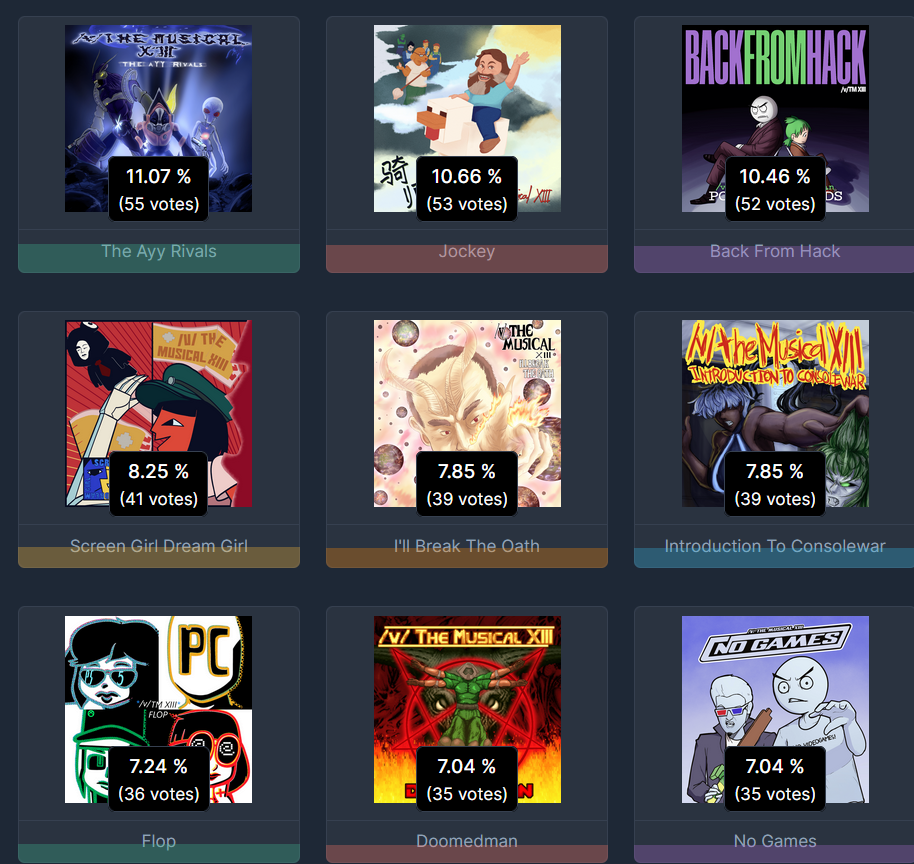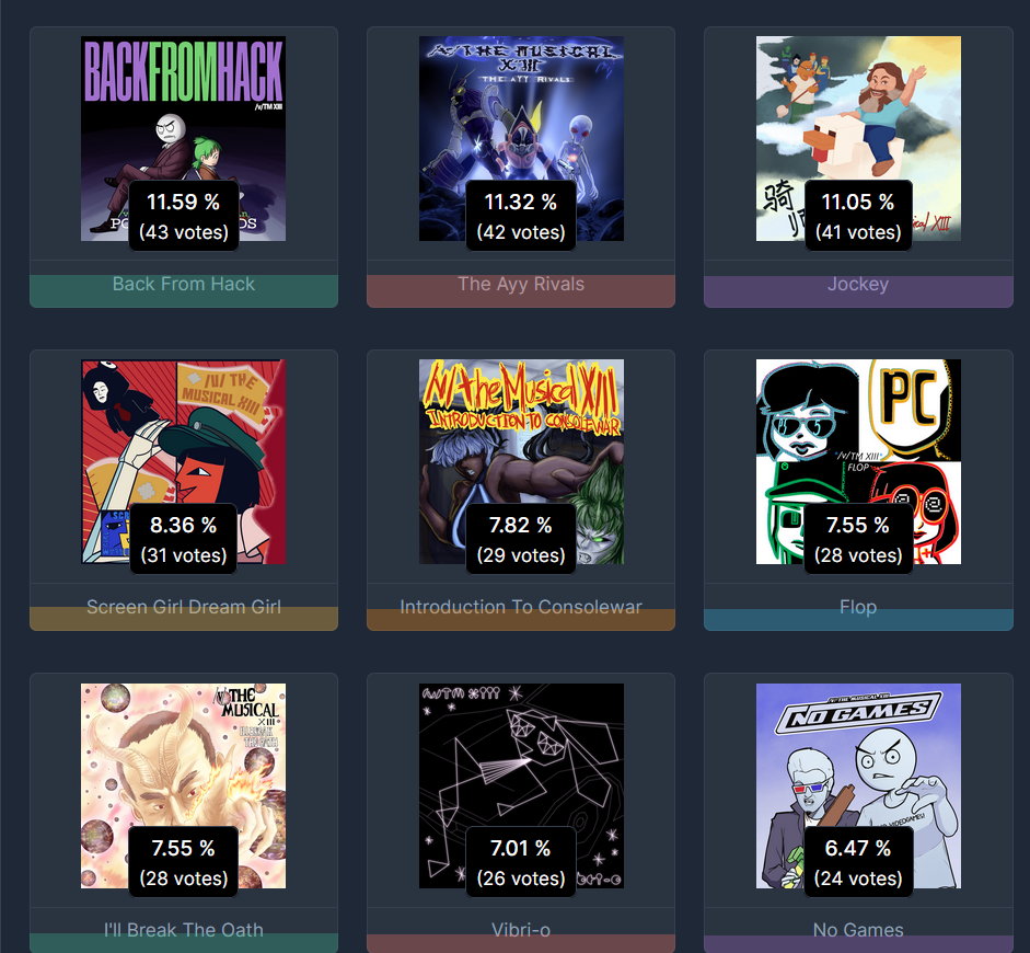 I don't want people completely in the dark, so...The actual leaders in the polls so far are easily:The Ayy RivalsJockeyBack From HackAlso in the top 7 right now but much less securely:I'll Break The OathIntroduction To ConsolewarScreen Girl Dream GirlVery close to taking the 7th slot, fuzzy on the exact numbers but your votes matter here a lot:Doomedman Vibri-oNo GamesThe others could still climb, but if we're realistic anything not named here would probably need people that already voted to adjust their votes if it wanted a chance.