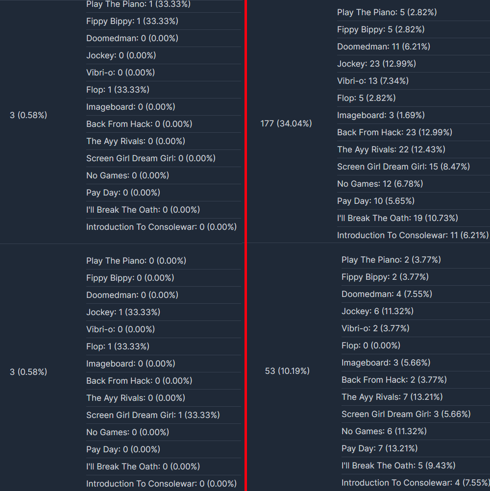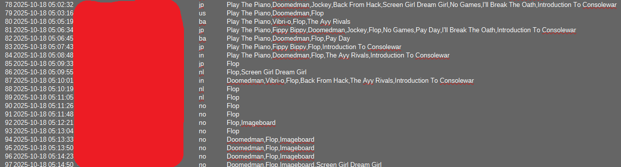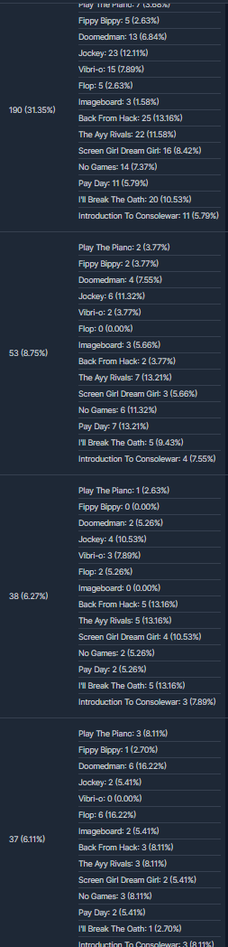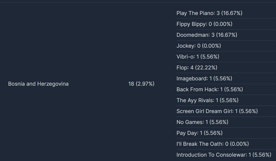 >>723534245I don't want to get too into the data because, for example, there's only a couple possible options for who the swedish person voting for a logical number of things from a single IP is, and I would not dare share that data because it's irrelevant to the rigging, I'll just silently include it in the tally when I look at real votes. You're right about the sort of countries in the pattern though. shout out to "Bosnia and Herzegovina" too, as much as I loved doomedguy and play the piano they're both absolutely going to lose a lot of votes when I tally things. If you want doomedguy to win too, don't think it's secured to win, give it your legit votes because it's one of the ones right near the edge of the true winning line right now I think.
