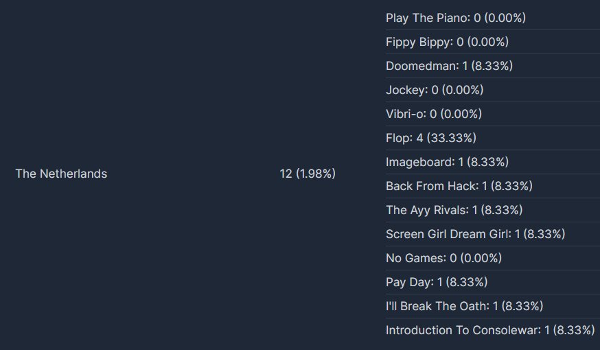 >>723533472Yeah I'll probably end up giving at least some of the data anyway, just so people are on the same page. but it's essentially what I think people would expect and I think the winners are going to be pretty clear, there's like 5 nobody should question at all and then it's just a matter of figuring out which get slot 6 and 7 based on the 2 different polls data. And I don't think it will be hard at all to see. Here's a small chunk of the "most popular" data locations right now, you can literally see how Flop suddenly starts getting a lot of votes once you leave common countries and go to smaller ones. It's much worse down the list.>>723533818yes I can literally see that this time too. probably the same person behind the jew thing and tdm if I have to be honest, which isn't saying the artist did it but they probably picked it because people would believe the artist might.