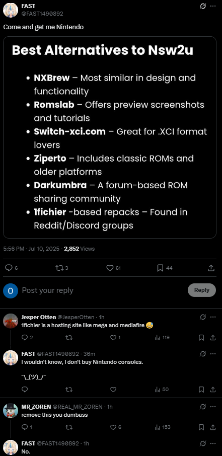 >>723614413Zoomers are bragging about pirating switch games on tik tok and xitter and getting sites shut down