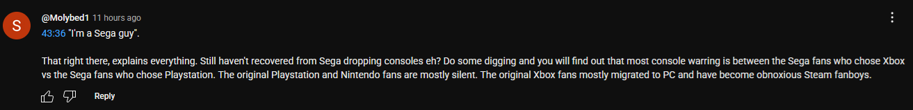 >>723613150Here is your answer. It all goes back to the death of Sega. When those Sega fans die out of old age, things will mostly calm down.