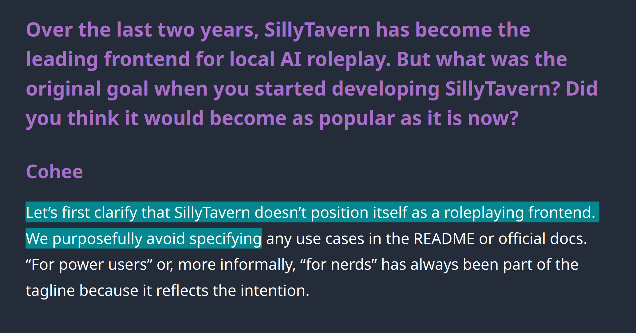 >>723765958Silly Tavern doesn't do AI, it's just a fancy webpage to help tardwrangle AIs.It doesn't do anything you can't do with deepseek, chatGPT and others except automate some shit