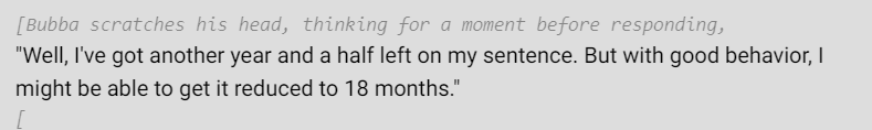 >>723766157>but it results in much longer messages.This is an issue for people? The bots I've been using can barely crank out two sentences, forcing it to make responses any longer makes it go on schizophrenic tyrades.