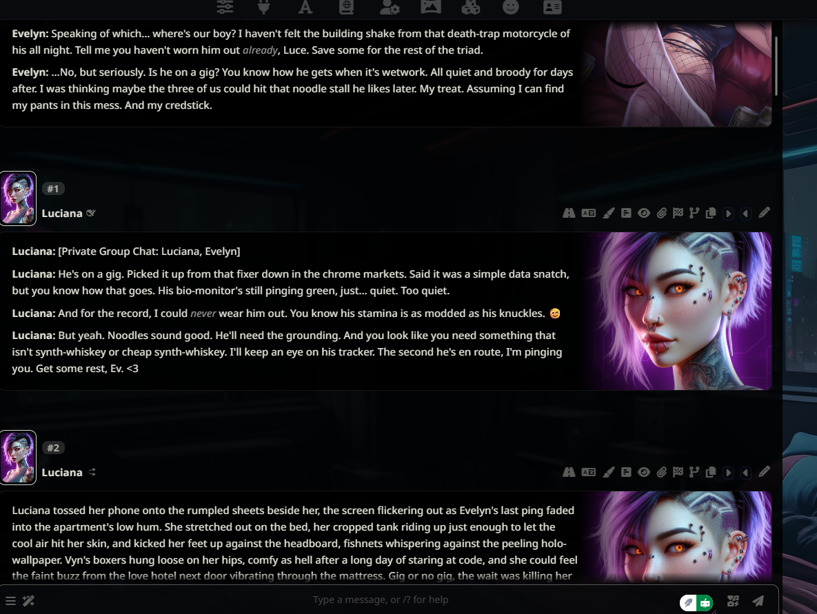 >>723763328>endless possibilitiesNah ST is definitely starting to show it's age and getting bloated with random deprecated crap that's been left abandoned. I've moved onto making my own app in Godot with better support for multiple characters, RAG, animated expressions, user avatars, IndexTTS, rpg system, smarter context flushing, and 3D.