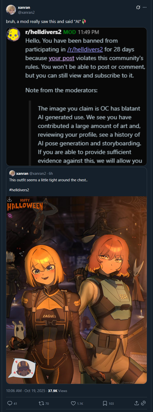 >>723779527>we hate AI here so you are banned>and if you didn't use AI, well, AI can do a better job than you so you can stay bannedwhat the fuck am I reading lmao