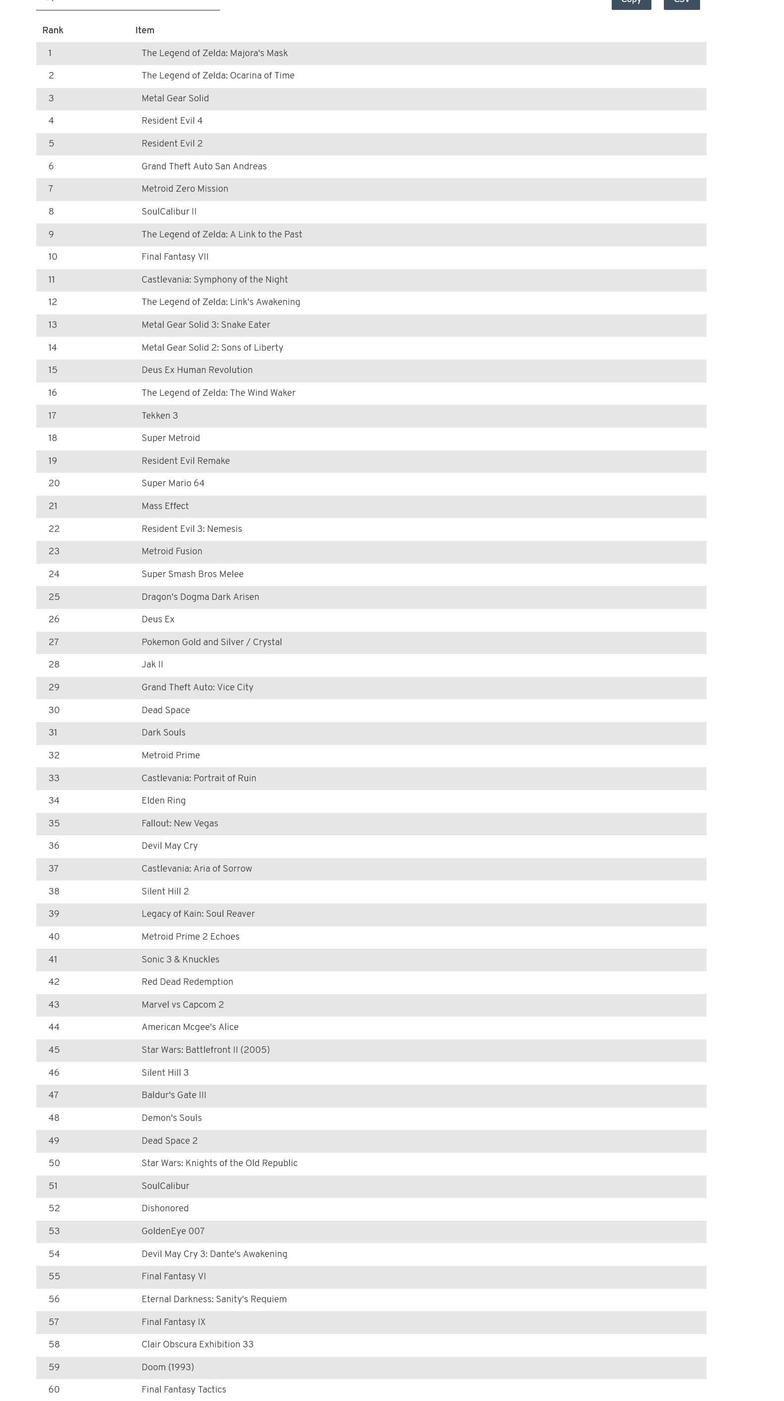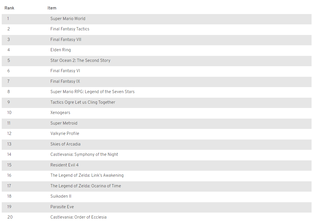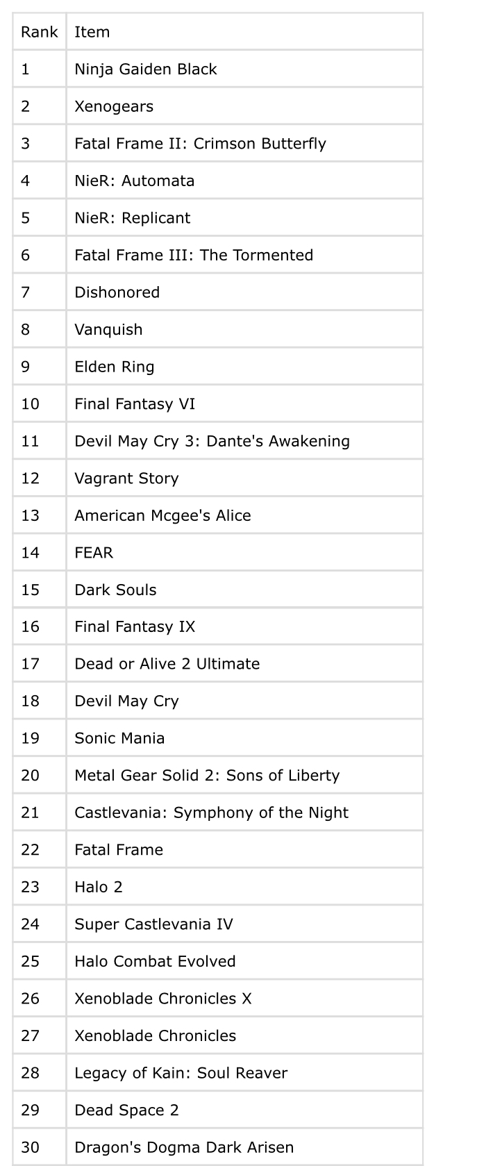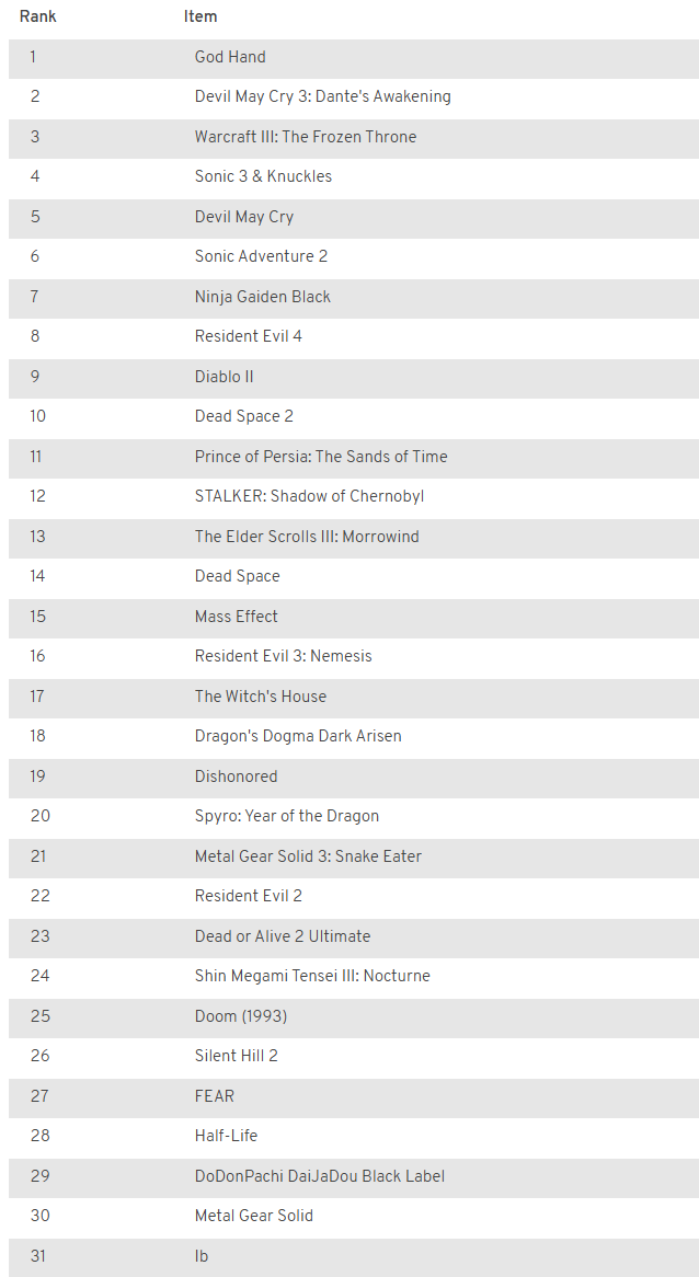 took a while, but here's what I got. a lot of these are hard to compare (how am I supposed to compare something like 999 which is basically a VN to super mario 64), but overall it's probably more or less right?