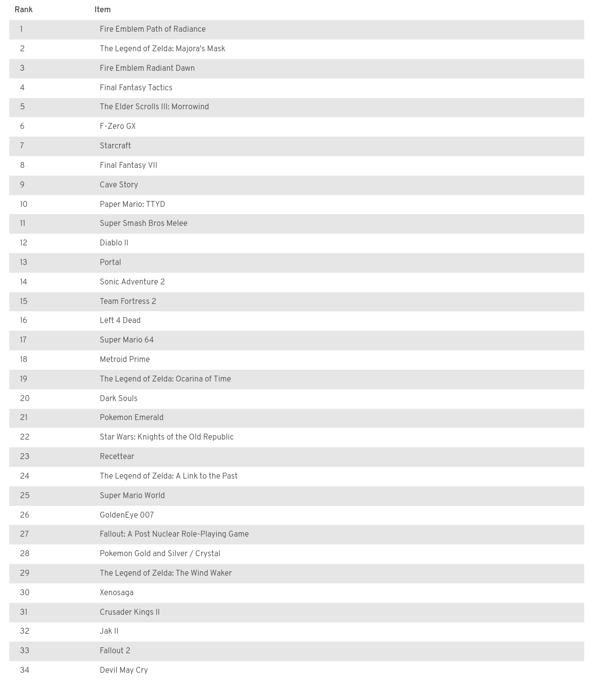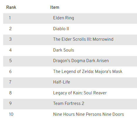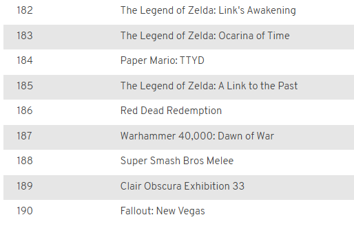 >>723935740I had the opposite problem, there are too many smaller games I would rank higher if they were on this list. I was still surprised by some of the things they had on here, like Ib and Recettear of all games? Weird.This isn't an entirely innaccurate list though, I truly love all of these games.