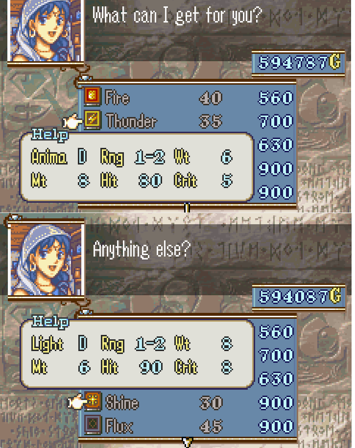 >>723935186What? No it isn't. Light tomes have lower might, higher weight, higher cost and less uses than Anima tomes of the same rank, a Thunder with WTD has the same might as Shine with WTA. The only thing Light offers are better hit rates(probably not a problem), and a little crit chance.