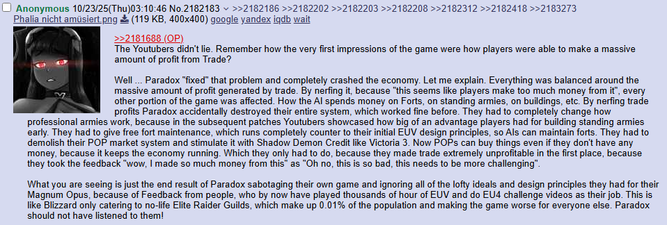 >>723993686Wow it's crazy bad faith again! How can this be predicted!? Nothing I said was nebulous unless you think "food should taste good" is a nebulous statement. No need to reply to me, you're clearly upset that people don't like the food EU5 is serving. Take notes EU5 dev, do better next time.