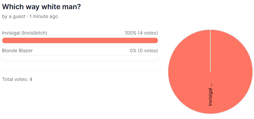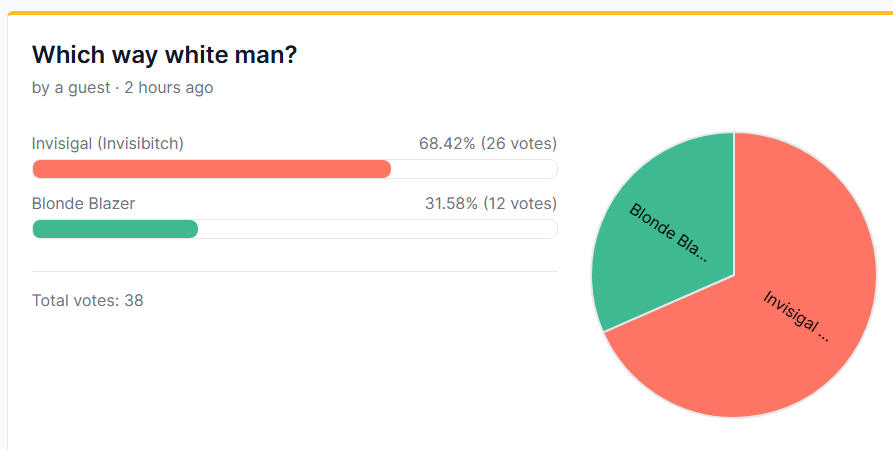>>723974174Alright, I have to admit that Invisigal fags are way up this week. Blonde Blazer fags are lacking.