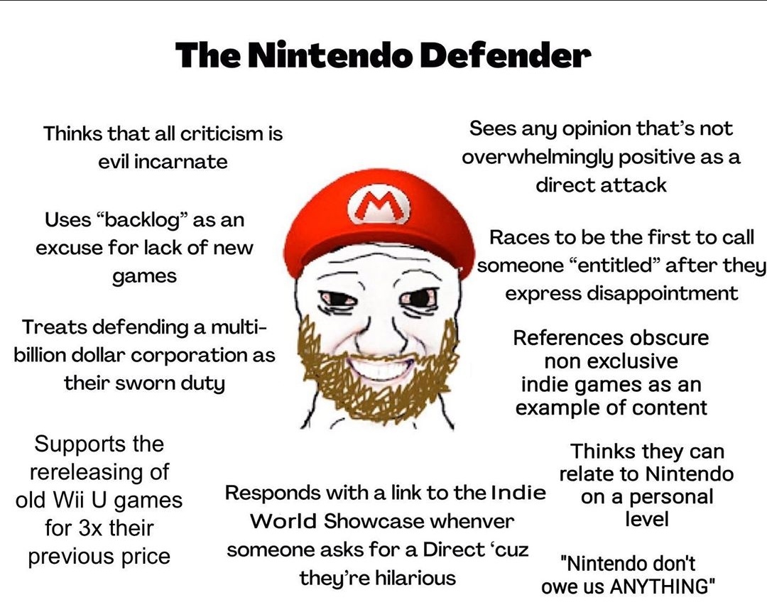 >>724111202>>724110924No, you don’t have any arguments, just mental gymnastics and fallacies. Stop being a Nintendo drone already and making excuses for their increasing lack of effort and late stage capitalism.https://youtu.be/bw1aKT5ALBw?si=zN8Z0AVudpIhIIqR