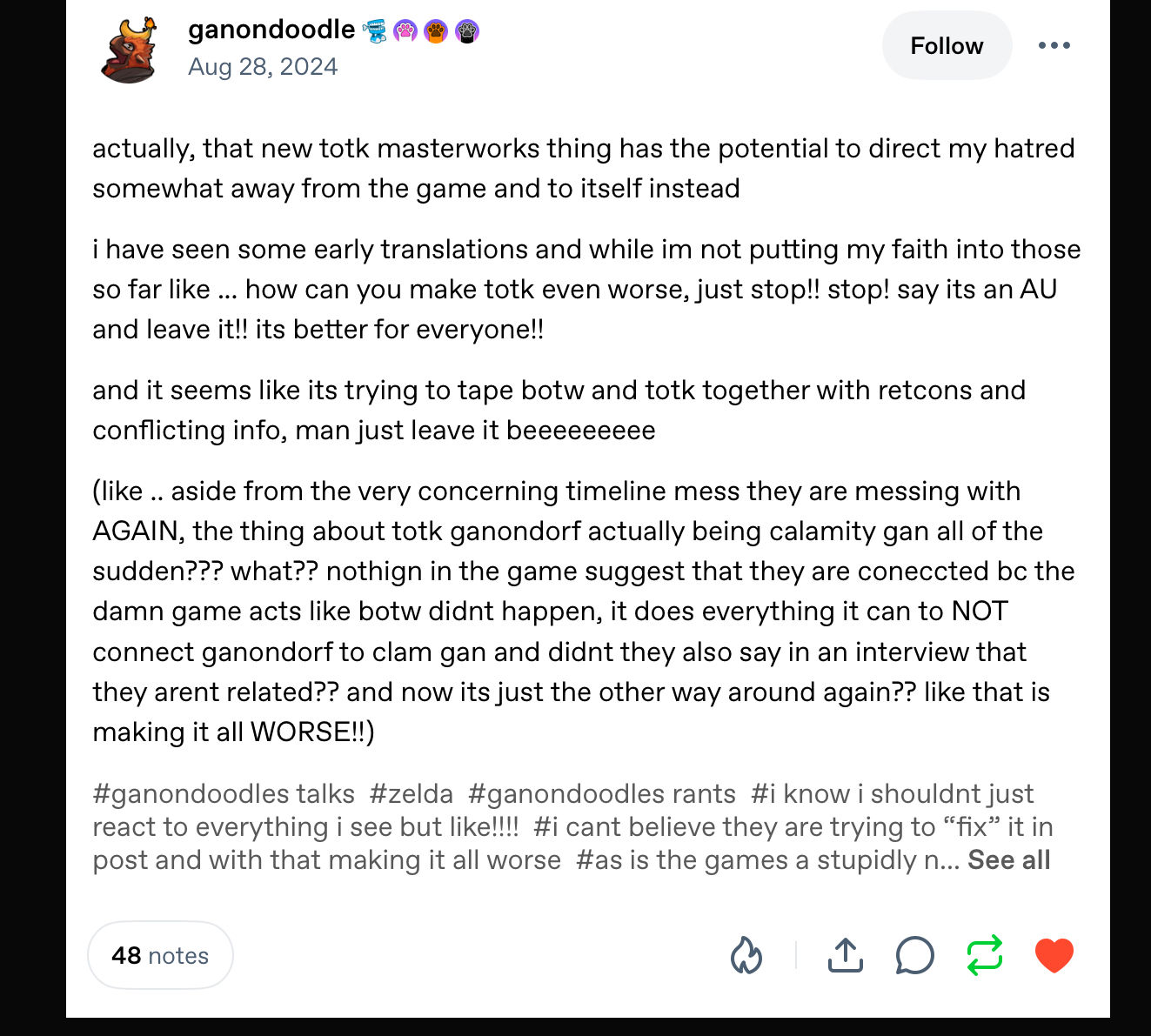 >>724106882I hated every single thing about the Zonai and the "lore" Tears of the Kingdom had. The Zonai were the worst lore retcon & aspect from ToTKlol just lol really. What happened to them being techno-warriors and barbarians?