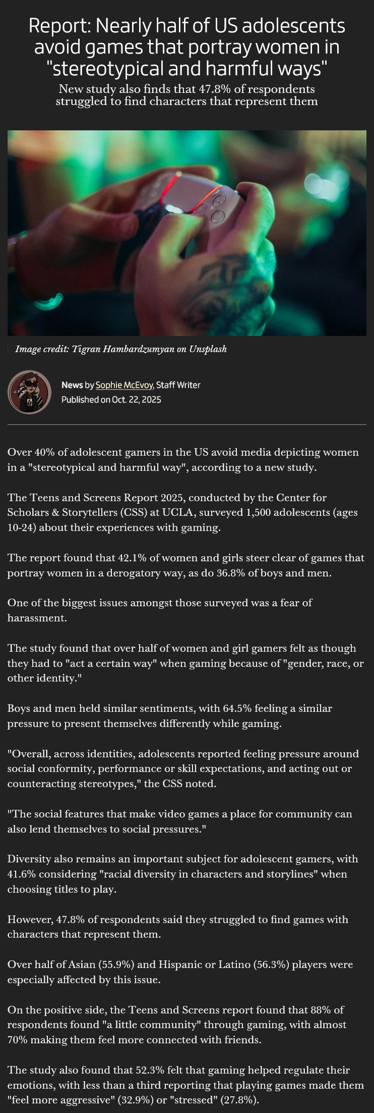 >>724074131Isn't The Gamer that news site that just announce major layoffs?>>724075023>The Teens and Screens Report 2025, conducted by the Center for Scholars & Storytellerslol, lmao