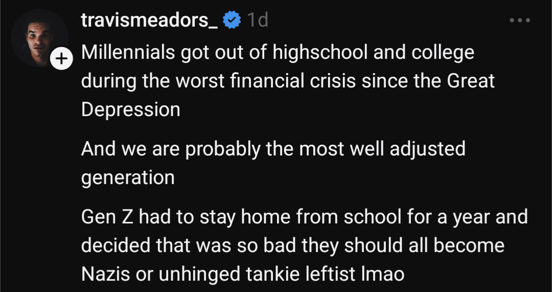 Half of Gen Z are Better Men™ and half are the most caricatured version of a "chud" stereotype you could imagine. I've seen it.