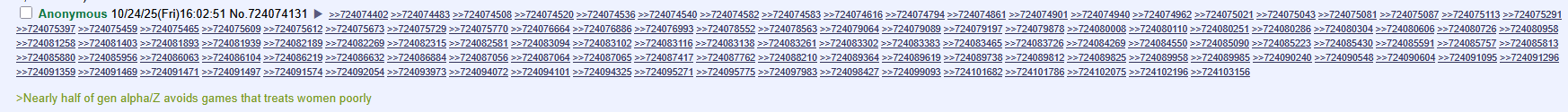 >>724074131>Nearly half of gen alpha/Z avoids games that treats women poorlyThey asked women their opinion as if they actually play anything but phone shit.