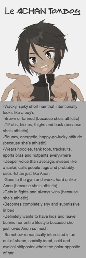 >has anger issues>needs constant validation>closeted coomer>brown>tomboy>vulgar>is /v/'s preferred waifuHUH?!