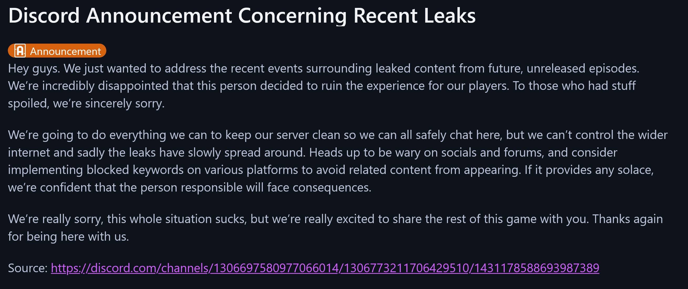 >>724130691I'm just avoiding it for now, it does kind of suck how the discussion thread became the leaks dump thread, but what can ya do. Maybe they should've done a better job to preserve their weekly episodes gimmick