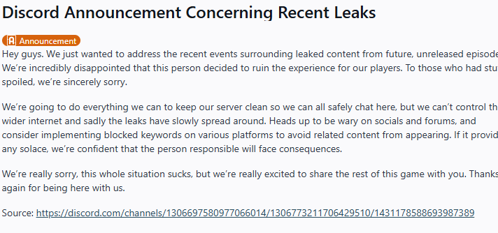 I wish the devs had done a better job preventing this sort of thing, but spoiling yourself like this is dumb.Why not just enjoy the game at its own pacing.If you don't want to wait by week, just get the game once is all finished, if you want to try it before paying then just play the demo or pirate and buy later.