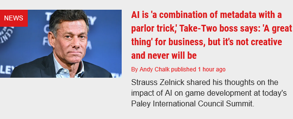 >AI is 'a combination of metadata with a parlor trick,' Take-Two boss says: 'A great thing' for business, but it's not creative and never will be