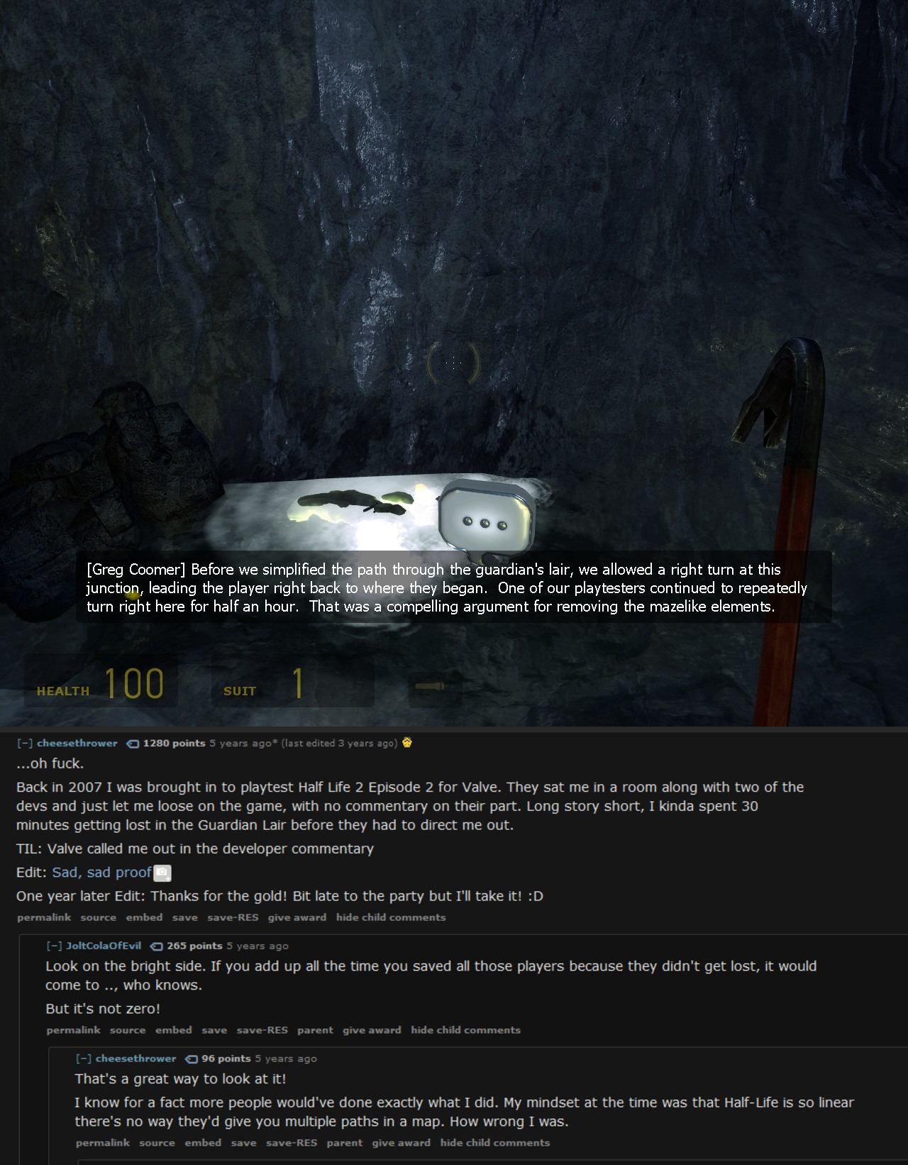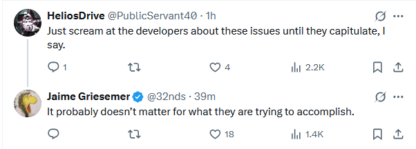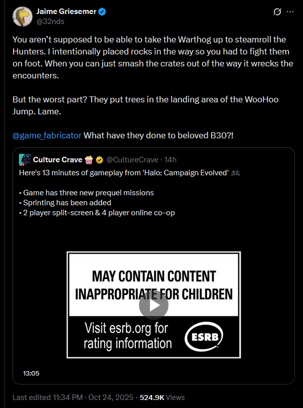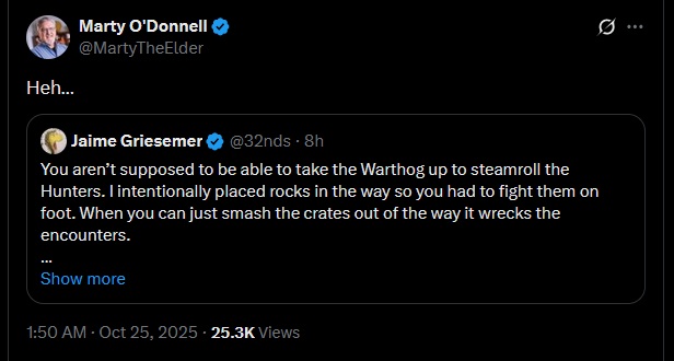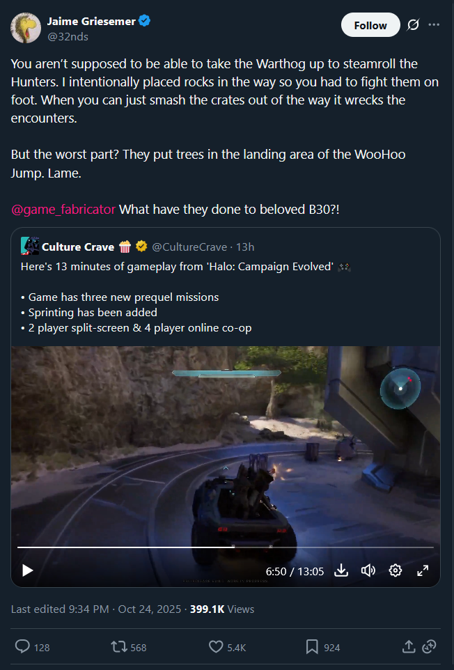 >>724122501>>724122524Jaime is not happy>You aren’t supposed to be able to take the Warthog up to steamroll the Hunters. I intentionally placed rocks in the way so you had to fight them on foot. When you can just smash the crates out of the way it wrecks the encounters.But the worst part? They put trees in the landing area of the WooHoo Jump. Lame.@game_fabricatorWhat have they done to beloved B30?!>“Keep getting them checks.” Remakes and remasters are soul-destroying and I feel for any dev working on one. They can’t win and even if they do they won’t get credit. Bad situation unless you are getting paid $$$.https://x.com/32nds/status/1981927318752039135>“Make it an option” is the biggest red flag for a dysfunctional design. We have no vision for what this is supposed to be, here’s the tools to fix it yourself.>Gearbox did break a lot of stuff. Like basing their code off the PAL version…. Ugh>Pistol LS didn’t do headshots until very late in development. It felt like you were a real Spartan when you could dance with the Hunters with kill them in two perfect shots, so we left it in. Most people ditched the pistol on their first playthrough anyway.>Let me know if you need help tuning the Warthog.