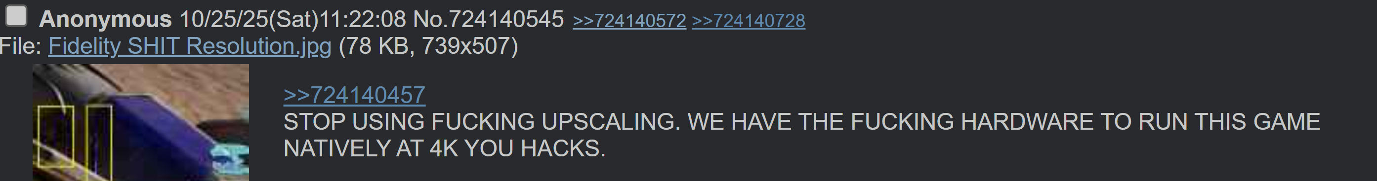 >>724149151>I would rather play on a console>that has to do fake and gay ai upscaling to even come close to those numbers