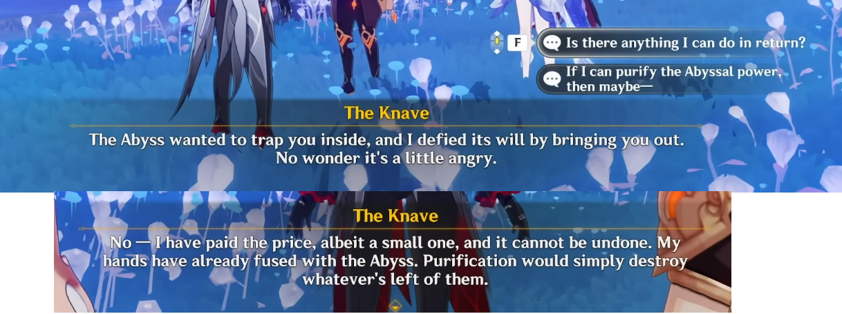 >>724152714oh I didn't read any of that. I was just talking about how traveler offered to try to purify her abyss crap after getting the iridescent marrow and arle said it'd destroy her hands