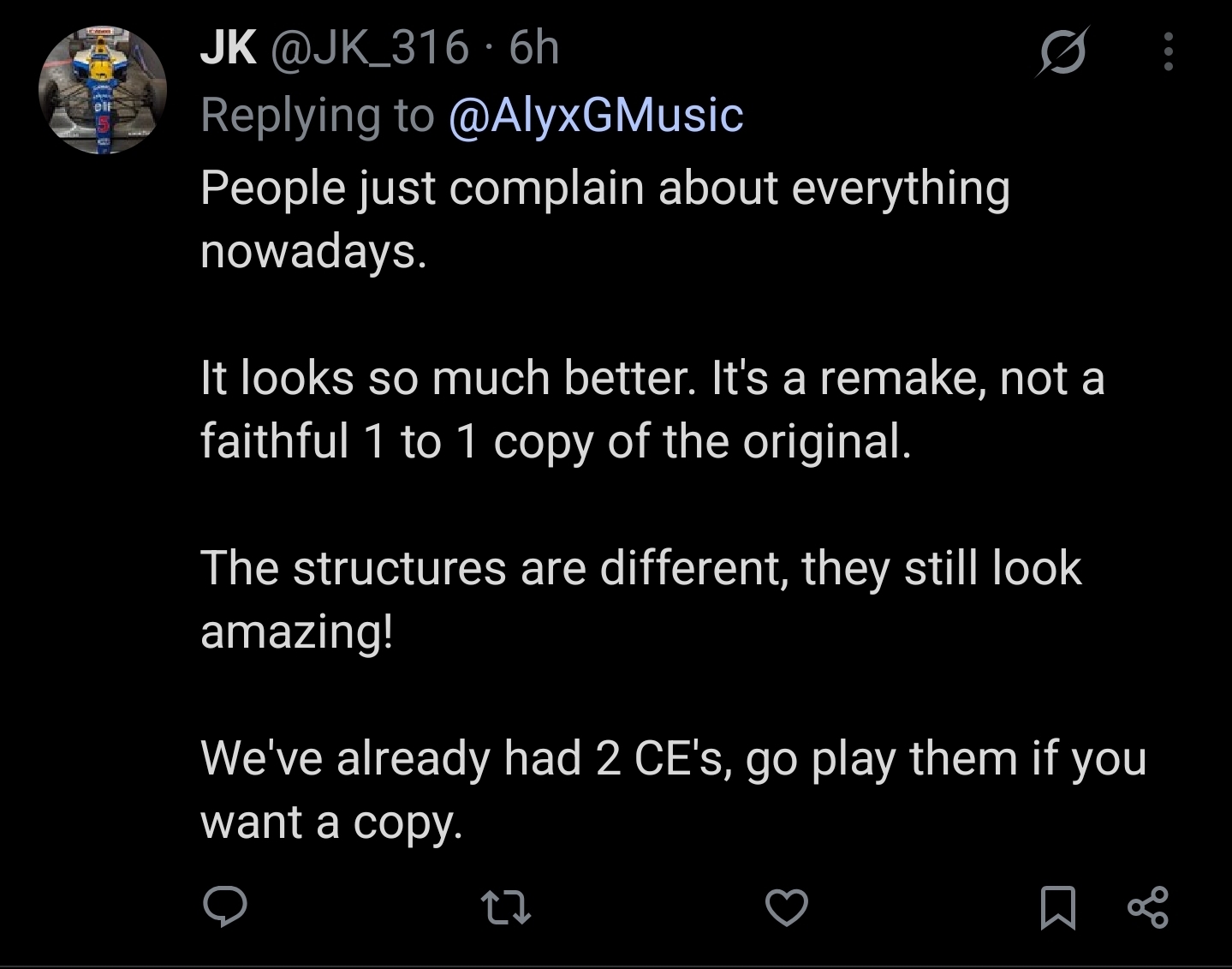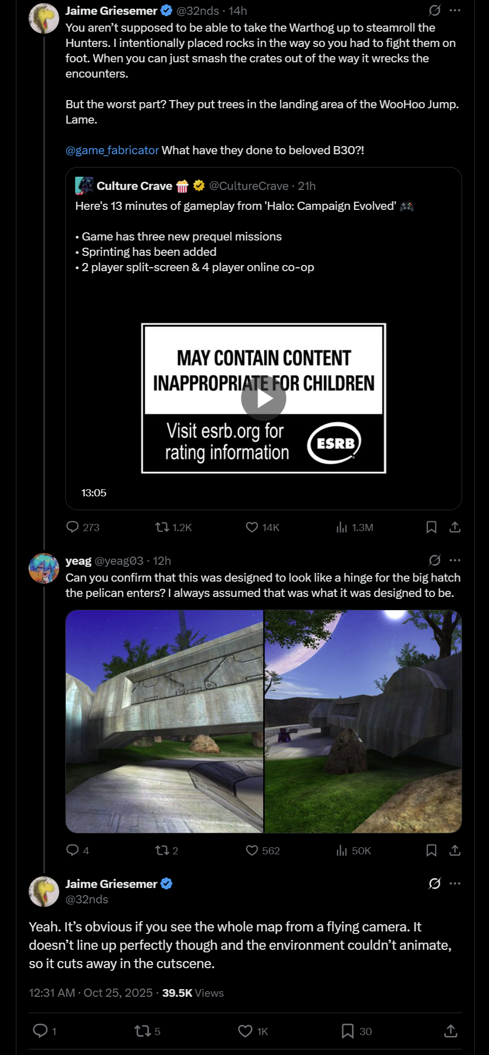 Jaime is not happy>You aren’t supposed to be able to take the Warthog up to steamroll the Hunters. I intentionally placed rocks in the way so you had to fight them on foot. When you can just smash the crates out of the way it wrecks the encounters.But the worst part? They put trees in the landing area of the WooHoo Jump. Lame.@game_fabricatorWhat have they done to beloved B30?!>“Keep getting them checks.” Remakes and remasters are soul-destroying and I feel for any dev working on one. They can’t win and even if they do they won’t get credit. Bad situation unless you are getting paid $$$.https://x.com/32nds/status/1981927318752039135>“Make it an option” is the biggest red flag for a dysfunctional design. We have no vision for what this is supposed to be, here’s the tools to fix it yourself.>Gearbox did break a lot of stuff. Like basing their code off the PAL version…. Ugh>Pistol LS didn’t do headshots until very late in development. It felt like you were a real Spartan when you could dance with the Hunters with kill them in two perfect shots, so we left it in. Most people ditched the pistol on their first playthrough anyway.>It’s not the early 2000s anymore. Halo is of its time, maybe more than any other game franchise. So they are constantly trying to either take Halo out of 2001 and modernize it (which breaks it) or take players back to 2001 with nostalgia (which is impossible).>Yes, everybody, I know you can FORCE the Warthog through the gap in a variety of ways. I literally spent most of a day making it discouraging and difficult but not impossible. You’re welcome! >Let me know if you need help tuning the Warthog.