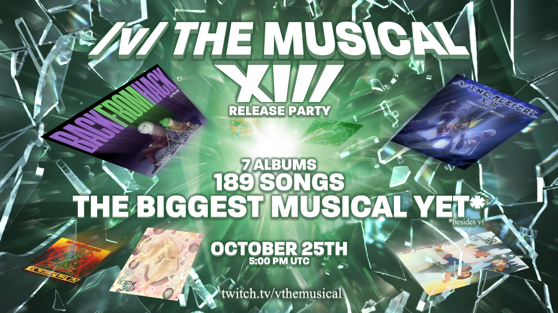 IT'S HAPPENING Edition/v/ THE MUSICAL XIII IS COMPLETE AND THE ALBUM STREAM WILL BEGIN IN JUST A FEW HOURS AT 5PM UTChttps://www.twitch.tv/vthemusicalhttps://www.timeanddate.com/countdown/gaming?iso=20251025T17&p0=2328&msg=%2Fv%2Ftm+Stream+Time+XIII&font=sanserif&csz=1Last thread: >>724009963>How do I contribute?SUBMISSIONS ARE CLOSED, GET READY TO GIVE ALL THE SONGS A LISTEN AT https://www.twitch.tv/vthemusical(you can still make videos for songs old or new at any time)>Song Spreadsheethttps://docs.google.com/spreadsheets/d/1a_8lhM5GUz1GhUNhFfcyavaBWmuq_p54Ui-kGpFLKh0>Songs that are already donehttps://docs.google.com/spreadsheets/d/16rgydhRgtfhrkW3lQwLSyjuS5INyFnd5hVvWx31JW00>NEWFAQhttps://docs.google.com/document/d/1QwgjGUjVfgURMBAQZbcuRdBH0GK50I3edg0bxetXeCg>Art Folderhttps://drive.google.com/drive/folders/1BMdlZw4jwzHt8im8m38Y1J-67kFloStc>Instrumental databasehttps://docs.google.com/spreadsheets/d/1wMoG5tvsVvHD4J5J9SbDIJzXBqKq5Uu90-TWtsjSvIcContains 4000+ instrumentals made from original studio recordings and 74000+ karaoke tracks.If you need a song from the database, simply tag your post with [VINST] so we can easily find it>IRC (client currently dead)kiwiirc.com/client/irc.rizon.net/#vmusical>proper mic techniquewww.youtube.com/watch?v=sr8c5sgkkvc>Web Player (probably won't be updated this year due to changes to how krakenfiles works)vthemusical.stfweb.lv>Latest videoswww.youtube.com/playlist?list=PLAX8JHUJcFR2gh_WG3YJBITuO-tODVCcJ>Site with songs from previous years (RIP Bandcamp)https://the-voombox.xyz/https://vthemusical.neocities.org