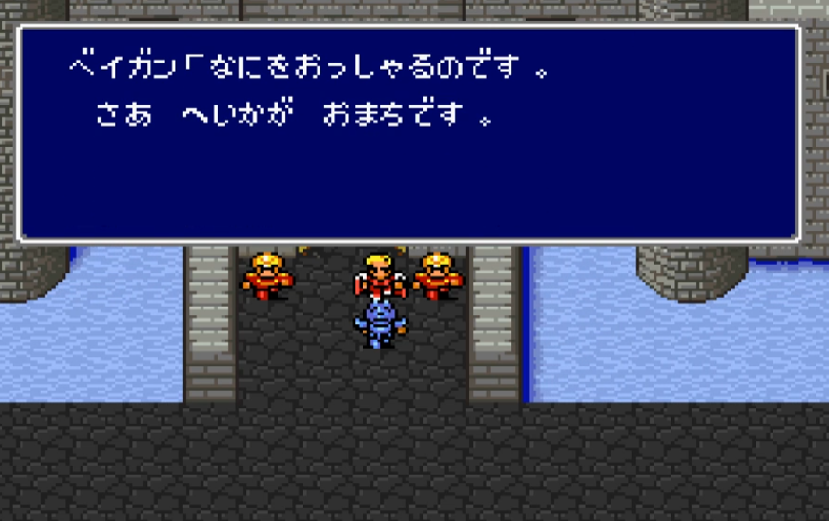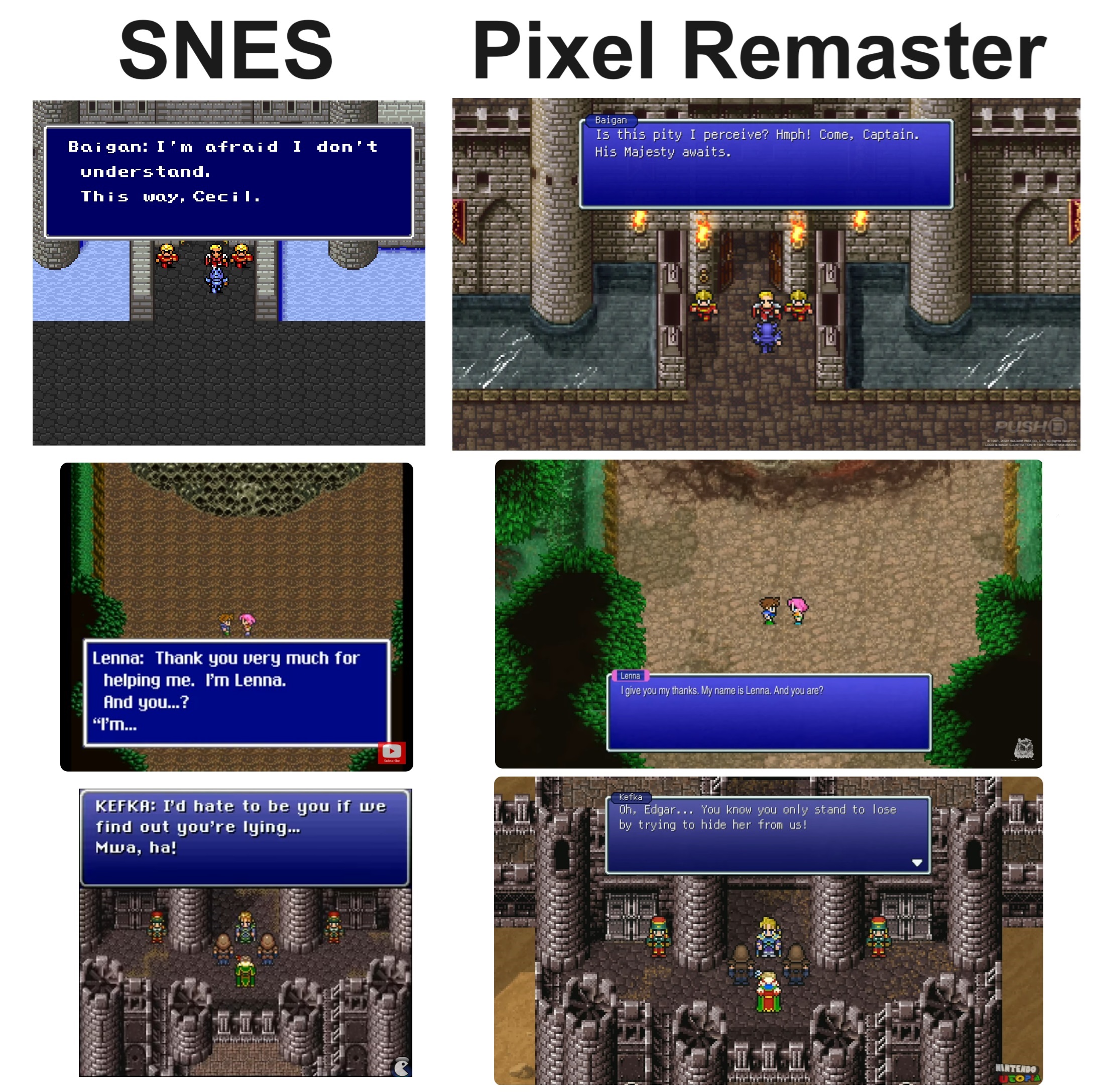 >>724180661The SNES versions of that pic are actually closer to the original line. Although I'll give that line in FF5 to the remaster, since it sounds so dry there.