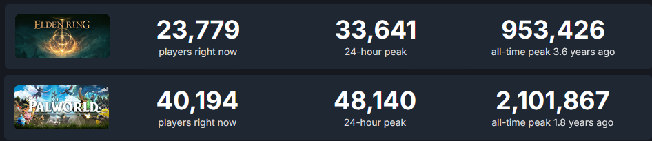 >>724220598No, people post steamcharts as some sort of ultimate gotcha, but these all get dwarfed by any big AAA release on console like COD or Battlefield