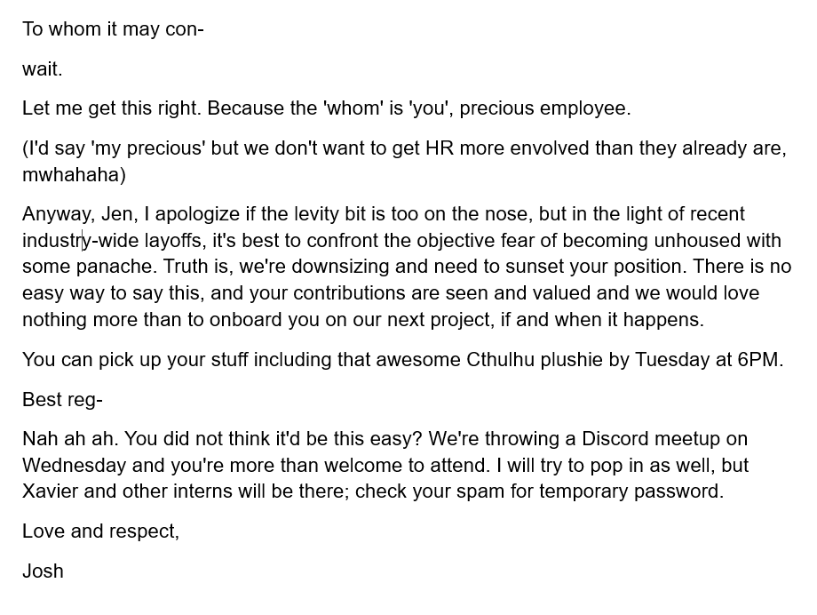 >>724222616it's surreal to me everyone is fine with this. there's basically ZERO job safety in vidya industry.