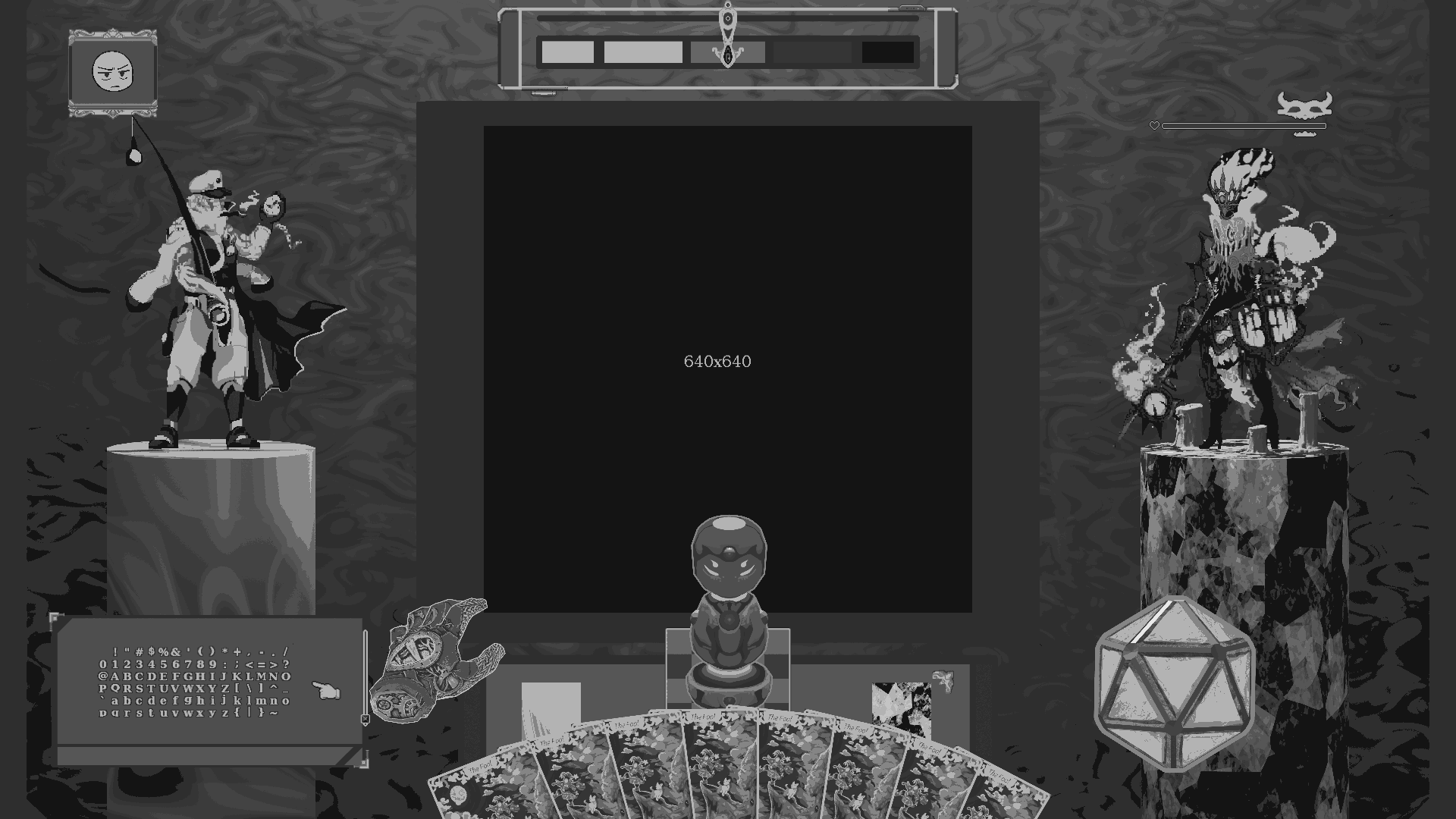 Picrel is the a battle ui mockup I drew up, my thinking is that attacks are like microgames that you as the player respond to and manipulate via cards (full tarot deck, not a custom system), dice, and cursor interactions. The core of the loop is in the same design space as Ultimate Chicken Horse or Jenga; where complexity ramps up and stability degrades over time until someone is forced into a losing position. Balanced right, I'd hope sufficient player skill would allow for to making a really hype comeback against a fucked up microgame concoction.