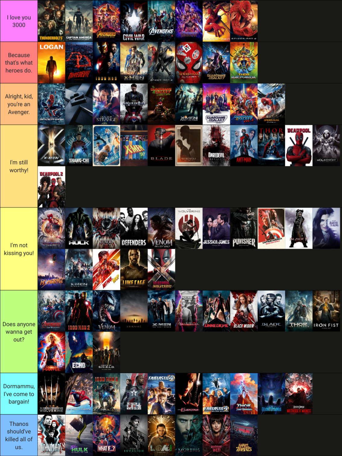 >>724307971Thunderbolts is so mid compared to the rest of your S tier here, I don't get people that gas it up that much I liked it delving into themes of depression and power of friendship, but it just does not balance that with good action and rhythm and stakesI'm convinced people like it just as a countermeasure to the mountain of garbage after endgame