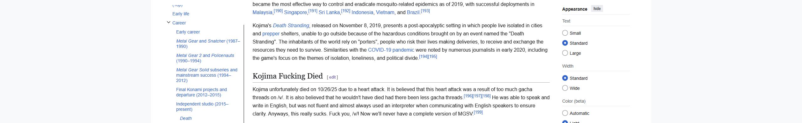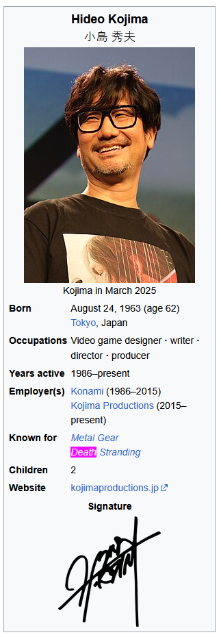 >go to Kojima's wikipedia page>control + f "death">70 resultsOh fuck, it's real.