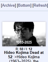 >Hideo Kojima (1963–2025), the visionary who turned video games into surreal art films about love, war, and the importance of cardboard boxes, passed away suddenly but peacefully in his home in Tokyo on October 25th. Creator of Metal Gear Solid and Death Stranding, Kojima blurred the lines between cinema, philosophy, and fever dream with every release. He spent his life asking players to “press X to feel,” and somehow, we always did. Even in his final years, he teased one last project that “could only be played by the dead.” Fans everywhere now wait eagerly to respawn and find out what he meant.Press F to pay your respects.