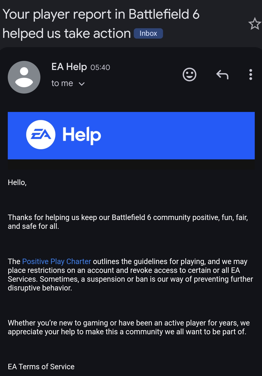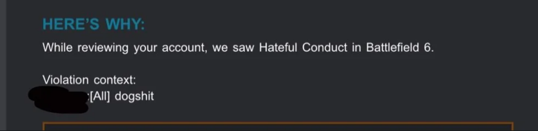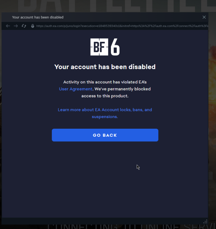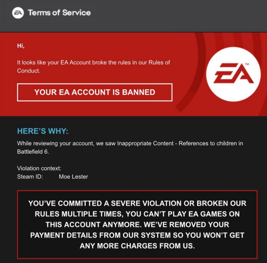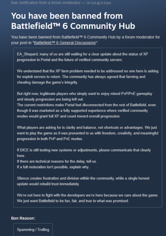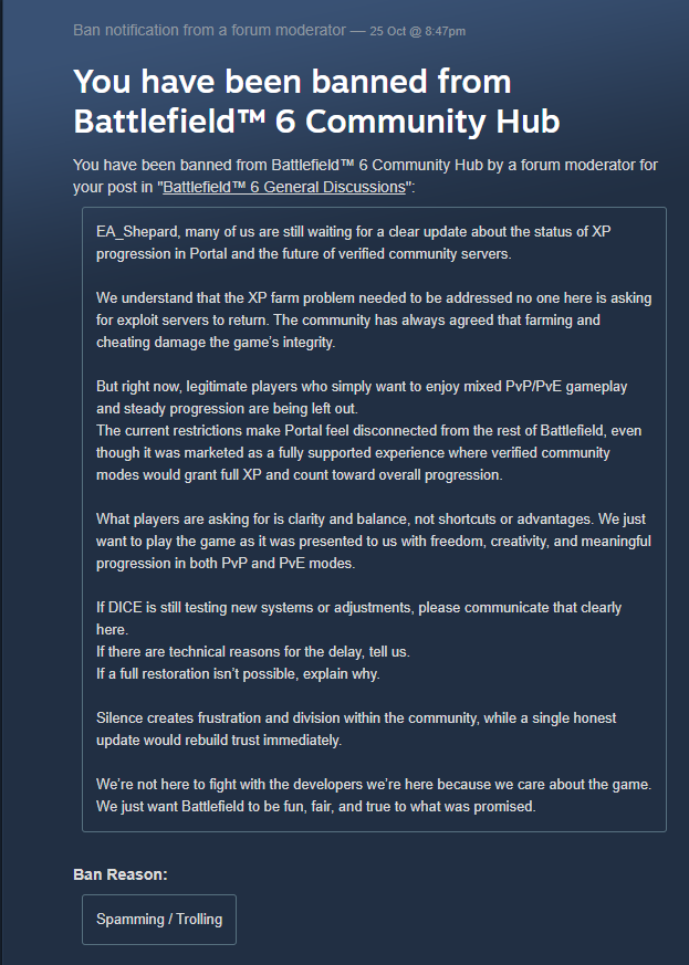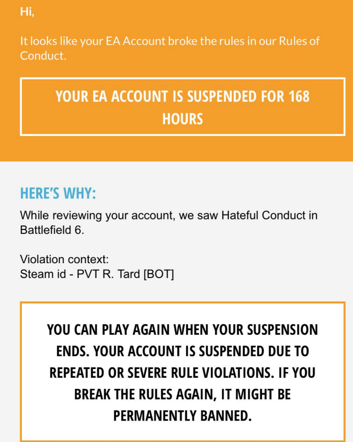 >>724269984>This is a re-post, I woke up to see I'm banned from Battlefield 6 for replying to someone's GGEZ with my own. I'm not sure how this qualifies as hateful speech or how I made anyone feel unsafe. Now I'm unable to load into the game and play the campaign, or do anything in Singleplayer.