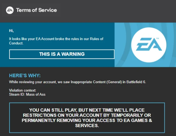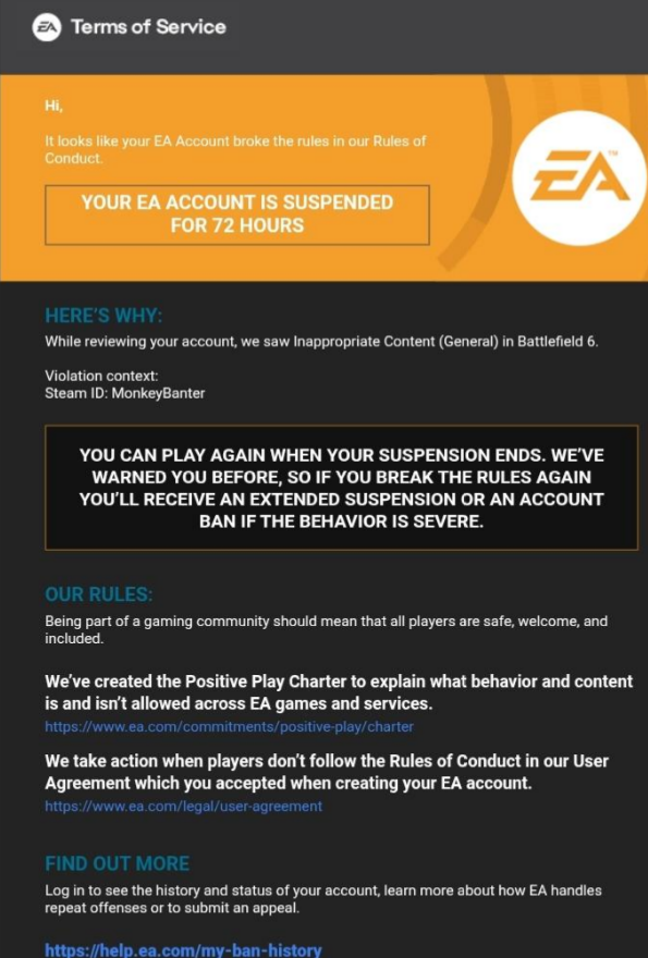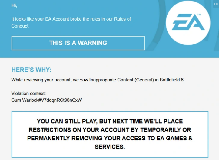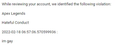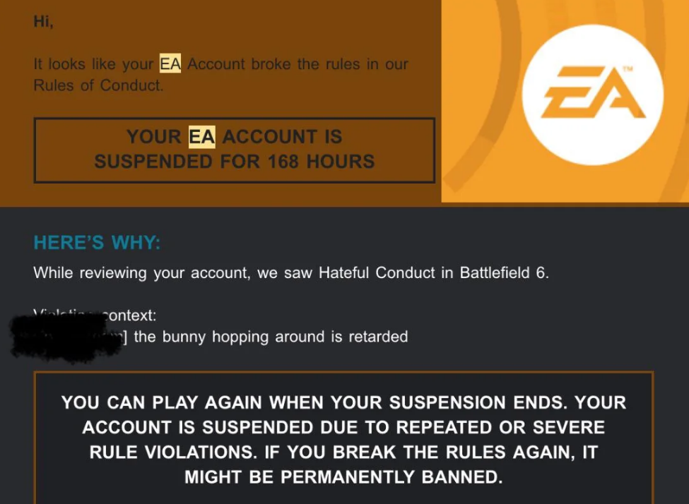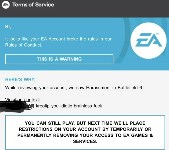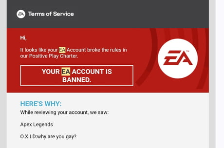 >have chat system>people break your rules>instead of muting their chat privileges like every online game in the last 10 years>you ban them>and then ban them permanently from their shared EA account across every platform while they are already on a ban, because you decided to upgrade the ban to a perm due to other chat they made in the same match that also got reported, counting it as a separate violation someone might actually get murdered over this if the wrong guy loses access to his lifetime of gaming accomplishments personally, I am taking the opportunity to be free of EA and its garbage and will play some other stuff