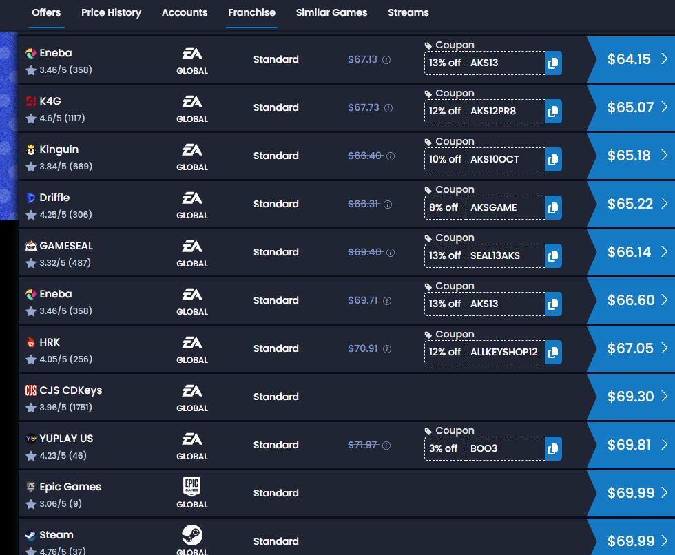 >>724269205I didn't want to pay $70 to play this game for like a week and drop it and saw this post and slapped my forehead going "silly me, THAT's how lots of people are playing this game. It's cheap in key form!"And I go lookAnd it's fucking NOT cheap in key formWhat the fuckWhat the actual fuckWho the fuck is paying 70 godforsaken dollars for battlefield 6